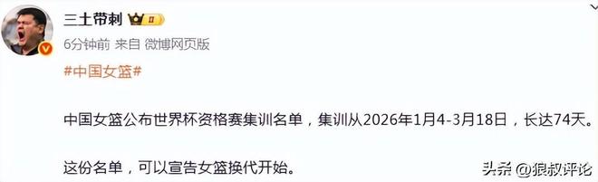媒体人“三土带刺”发文点评:中国女篮公布世界杯资格赛集训名单,集训从2026年1月4日-3月18日,长达74天。