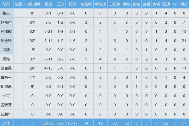 周琦+胡金秋,合砍40分15板都于事无补,孙铭徽(投篮21中6)为首的外线群把篮筐砸烂,全队三分球27中6,命中率低至可怜的约22%。