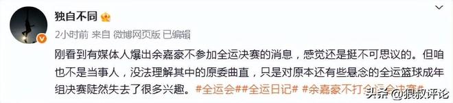 青岛记者杜金城发文点评:“感觉还是挺不可思议的。但咱也不是当事人,没法理解其中的原委曲直,只是对原本还有些悬念的全运篮球成年组决赛陡然失去了很多兴趣。”