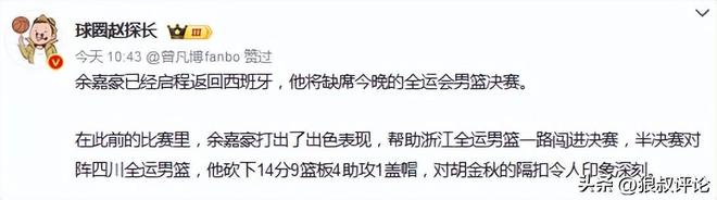 余嘉豪缺席全运男篮决赛引热议!浙江领衔多单位挽留 最终协商无果