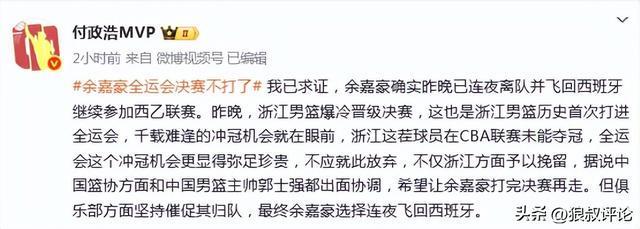 根据媒体人“付政浩”的爆料,我已求证,余嘉豪确实昨晚已连夜离队并飞回西班牙继续参加西乙联赛。昨晚,浙江男篮爆冷晋级决赛,这也是浙江男篮历史首次打进全运会,千载难逢的冲冠机会就在眼前,浙江这茬球员在CBA联赛未能夺冠,全运会这个冲冠机会更显得弥足珍贵,不应就此放弃,不仅浙江方面予以挽留,据说中国篮协方面和中国男篮主帅郭士强都出面协调,希望让余嘉豪打完决赛再走。但俱乐部方面坚持催促其归队,最终余嘉豪选择连夜飞回西班牙。