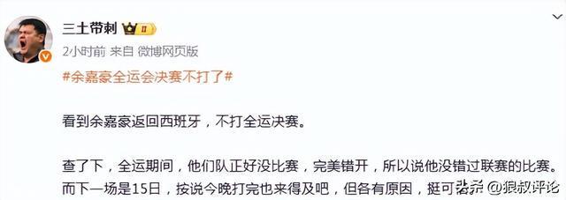 媒体人“三土带刺”发文点评:“全运期间,他们队正好没比赛,完美错开,所以说他没错过联赛的比赛。而下一场是15日,按说今晚打完也来得及吧,但各有原因,挺可惜。”