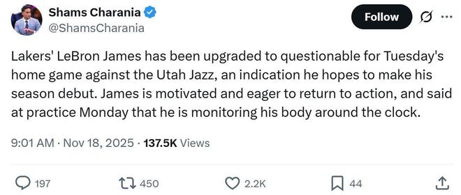 根据名记Shams报道,詹姆斯的伤病状态已经升级为出战成疑,不出意外,他最快将在明天湖人对阵爵士队的比赛中复出。