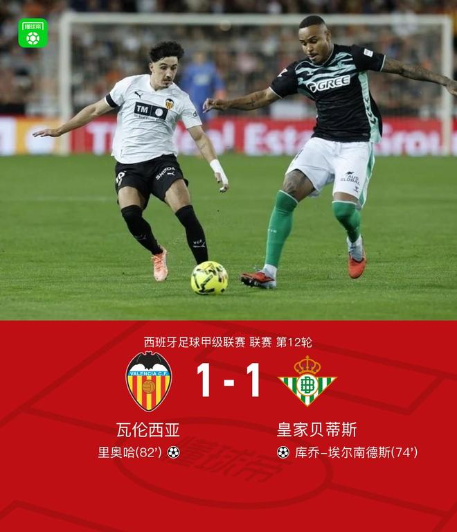 北京时间11月10日,西班牙足球甲级联赛第12轮,瓦伦西亚坐镇主场迎战皇家贝蒂斯。比赛中,皇家贝蒂斯由阿布德送出助攻,库乔-埃尔南德斯破门得分。随后,瓦伦西亚球员里奥哈攻入一球,帮助球队扳平比分。最终,双方以1比1握手言和。