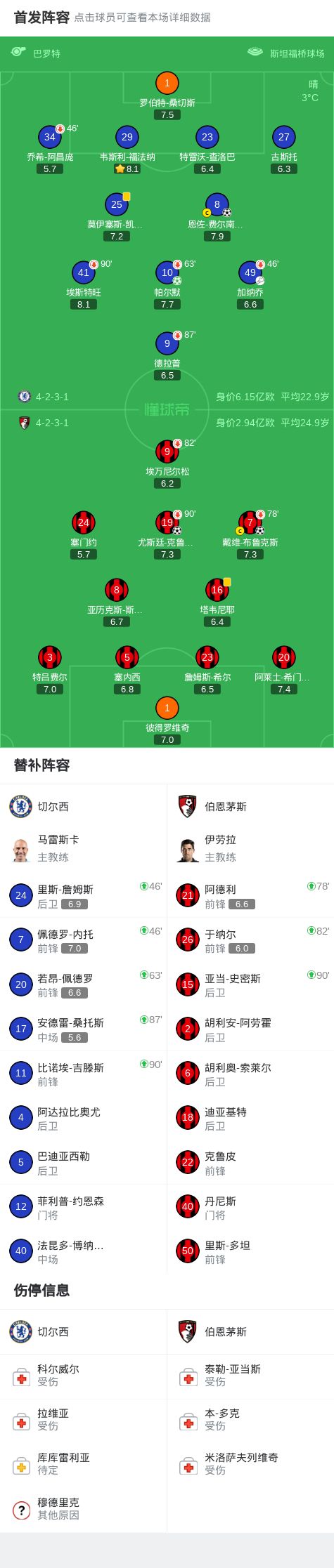 北京时间12月31日英格兰足球顶级联赛 联赛 第19轮,切尔西主场对阵伯恩茅斯。上半场,布鲁克斯率先破门。埃斯特旺造点,帕尔默点射扳平比分。加纳乔助攻,恩佐劲射建功。随后,小克鲁伊维特为客队扳平比分。下半场,两队均无建树。全场比赛结束,切尔西2-2战平伯恩茅斯,遭遇英超联赛3轮不胜。